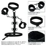 Amplíe los límites del placer y disfrute de infinitas posibilidades de bondage con el sistema de sujeción corporal CalExotics Boundless Collar. Ponte este atrevido sistema de sujeción y explora el juego apasionado con los puños universales de cuero vegano, el cuello resistente y la correa de sujeción de varios niveles. Tanto los fetichistas como los principiantes tímidos pueden disfrutar de un apasionado juego de placer deslizándose en las sujeciones perversamente sexys y los puños acolchados de cuero sintético. Una vez que hayas envuelto este hermoso collar pecaminoso alrededor de tu cuello, tu dominante se deleitará en usar los múltiples niveles de restricciones para comandar y controlar tu placer. Los puños de cuero vegano de felpa están equipados con un cierre universal de alta resistencia con un diseño giratorio para brindarle a su placer un rango completo de movimiento. Además, los puños desmontables se pueden usar de forma independiente para más aventuras. Incluso a los más nuevos en el juego sumiso les encantará la emocionante comodidad de la lujosa capa interior del cuello y el diseño de doble acolchado y doble costura del puño. Haz realidad tus sueños más eróticos y sumérgete en tus deseos más aventureros con este collar de sujeción corporal sensacionalmente cómodo.