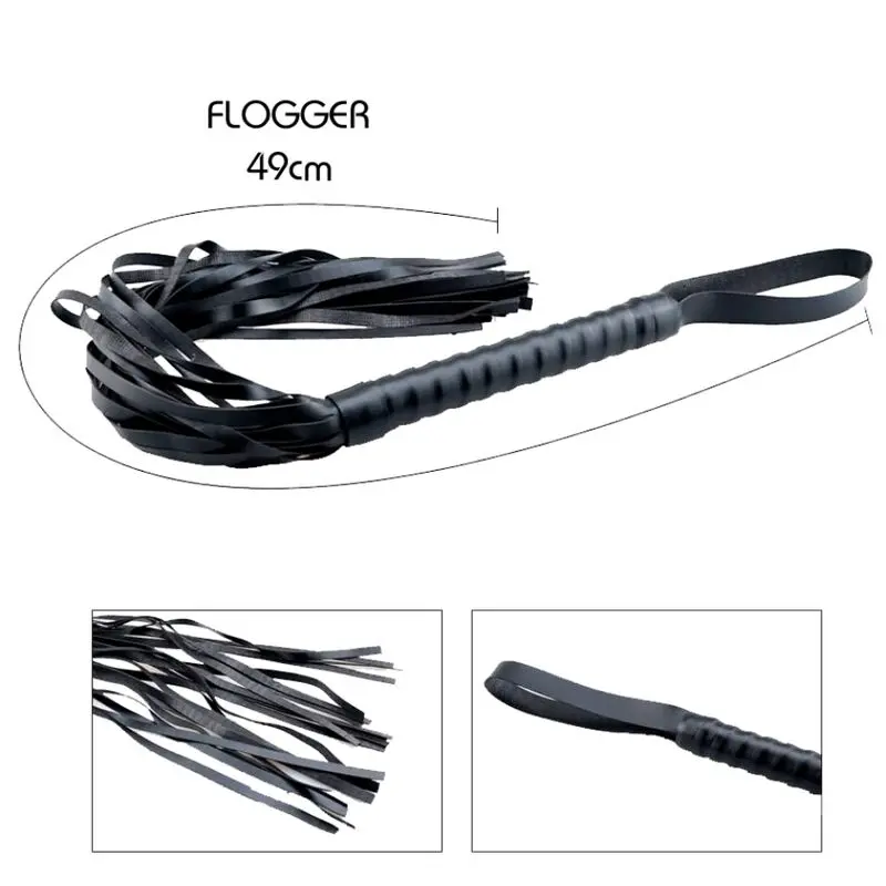 - Látigo: El látigo es un implemento clásico en el BDSM utilizado para proporcionar una variedad de sensaciones, desde suaves caricias hasta golpes más intensos. Su presencia en el kit agrega la posibilidad de explorar la estimulación sensorial y los juegos de impacto.