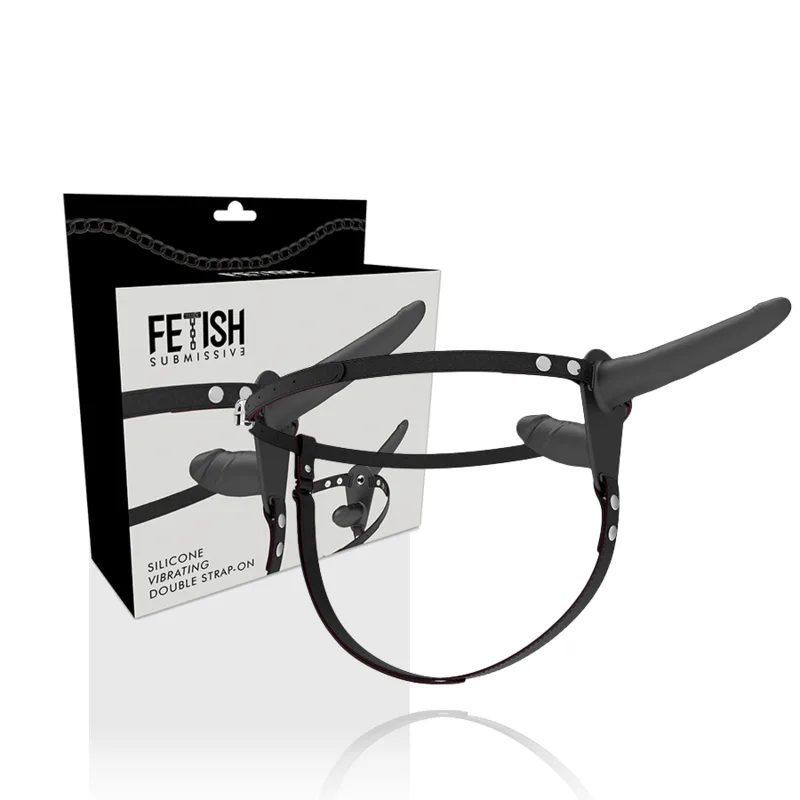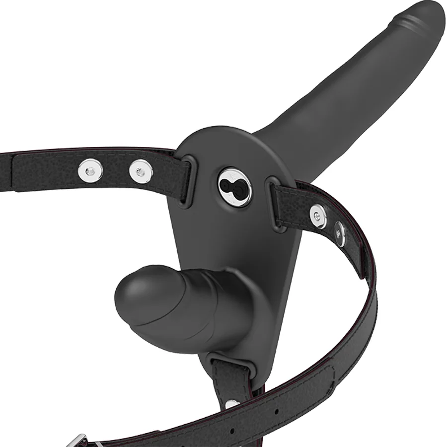 Arnés doble penetración ajustable a cualquier talla de cadera, incluso las más grandes. El dildo está fabricado en silicona de primera calidad.