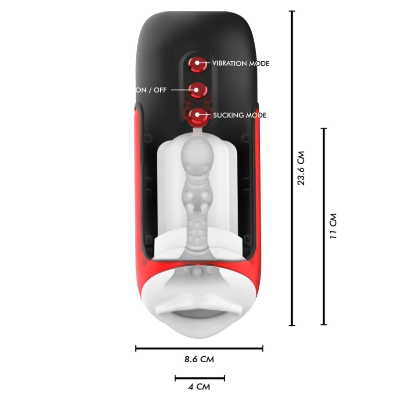 El masturbador automático con forma de boca para hombre BLAZE de la marca JAMYJOB es un dispositivo innovador y elegante, diseñado para proporcionar una experiencia estimulante y placentera de alta calidad. Con un diseño en color negro y rojo y detalles en rojo, este masturbador combina estética y funcionalidad en un solo producto.