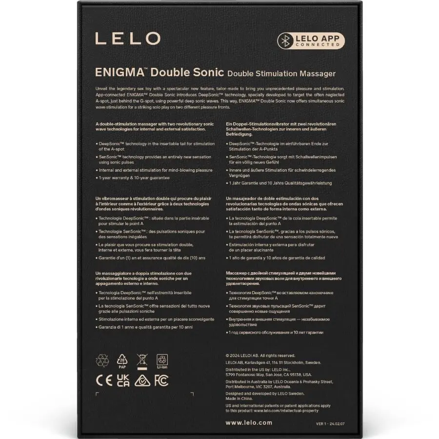 El vibrador para el punto A ENIGMA™ Double Sonic es la última incorporación a la gama ENIGMA™ de LELO. Con él te presentamos la tecnología DeepSonic™, que se centra en el tan a menudo desatendido punto A. Además, cuenta con ocho modos de placer y otros dos modos de control exclusivos de la aplicación que podrás utilizar cuando te conectes a la aplicación LELO. Gracias a su punta sónica especial, que se encuentra en la cola insertable, ENIGMA™ Double Sonic estimula una zona erógena más amplia para alcanzar el punto A con sus profundas ondas sónicas y ofrecerte orgasmos vaginales más intensos. También envía ondas sónicas al clítoris, además de vibraciones al punto G.