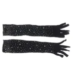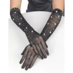 El detalle más llamativo de estos guantes es su acabado con destellos de brillo y apliques de diamantes de fantasía, que capturan la luz y añaden un toque de lujo y magnetismo. Ideales para ocasiones especiales, estos guantes aportan un aire de misterio y elegancia que complementa perfectamente conjuntos seductores o looks de alta moda.
