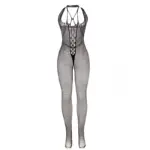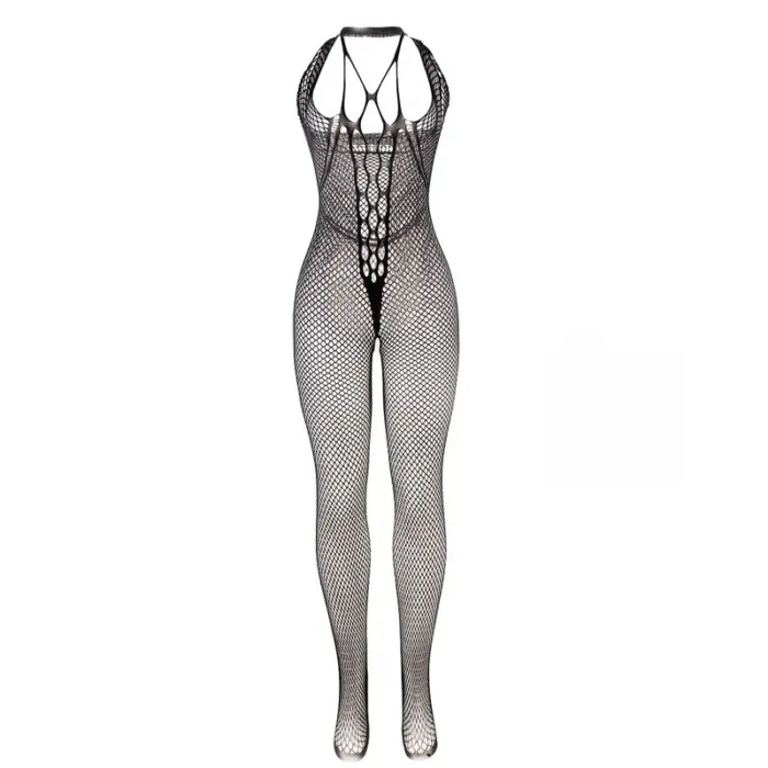 - Estilo: Bodystocking largo de rejilla en negro con tirantes en el pecho y la espalda.