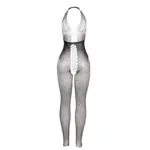 - Estilo: Bodystocking negro con espalda abierta y detalles entrecruzados.