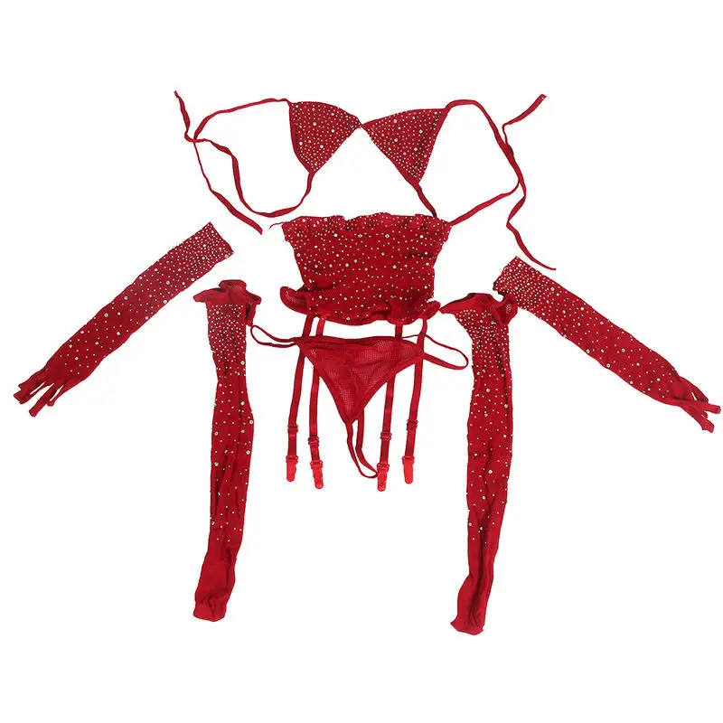 Subblime – 952181 bodystocking de rejilla con guantes y diamantes rojo talla única