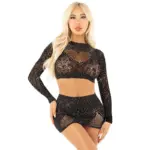 - Material de Rejilla con Brillantes: El top y la falda están confeccionados en una rejilla negra con pequeños brillantes que capturan la luz, añadiendo un toque de glamour y sofisticación.