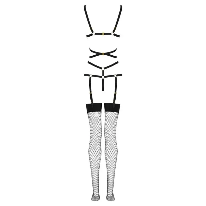 La parte superior del conjunto consta de sexys rayas negras, entrelazadas en el vientre y conectadas con anillos. Los tirantes de la parte superior rodean elegantemente el busto sin cubrirlo, mientras que en la parte inferior se transforman suavemente en un tanga. Tiras individuales corren a ambos lados del tanga, abrazando encantadoramente las caderas. La parte inferior del conjunto se compone de medias negras de largo regulable, confeccionadas en malla. Las medias se sujetan con broches al elemento superior del conjunto, por delante y por detrás.
