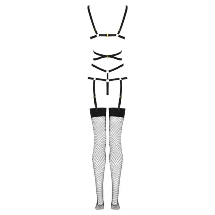 La parte superior del conjunto consta de sexys rayas negras, entrelazadas en el vientre y conectadas con anillos. Los tirantes de la parte superior rodean elegantemente el busto sin cubrirlo, mientras que en la parte inferior se transforman suavemente en un tanga. Tiras individuales corren a ambos lados del tanga, abrazando encantadoramente las caderas. La parte inferior del conjunto se compone de medias negras de largo regulable, confeccionadas en malla. Las medias se sujetan con broches al elemento superior del conjunto, por delante y por detrás.