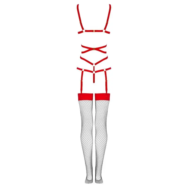 La parte superior del conjunto consta de sexys rayas negras, entrelazadas en el vientre y conectadas con anillos. Los tirantes de la parte superior rodean elegantemente el busto sin cubrirlo, mientras que en la parte inferior se transforman suavemente en un tanga. Tiras individuales corren a ambos lados del tanga, abrazando encantadoramente las caderas. La parte inferior del conjunto se compone de medias negras de largo regulable, confeccionadas en malla. Las medias se sujetan con broches al elemento superior del conjunto, por delante y por detrás.