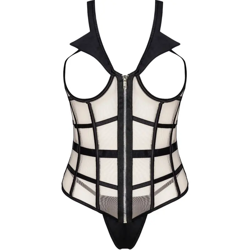 Un conjunto de dos piezas compuesto por un sensual corsé con el pecho al descubierto y un sexy tanga negro. El corsé tiene una cremallera en la parte delantera, lo que facilita su colocación. Los colores del conjunto son el negro y el beige, que juntos crean una atractiva combinación. También vale la pena prestar atención a detalles tentadores como un cuello negro o cinturones negros dispuestos de tal manera que realcen mejor la cintura. Lo que más destaca de este corsé son los recortes que exponen el busto. Esto hace que todo el conjunto sea muy atrevido y provocativo. No queda mucho a la imaginación. Las pegatinas para pezones serán una gran adición al juego y agregarán algo de sabor.