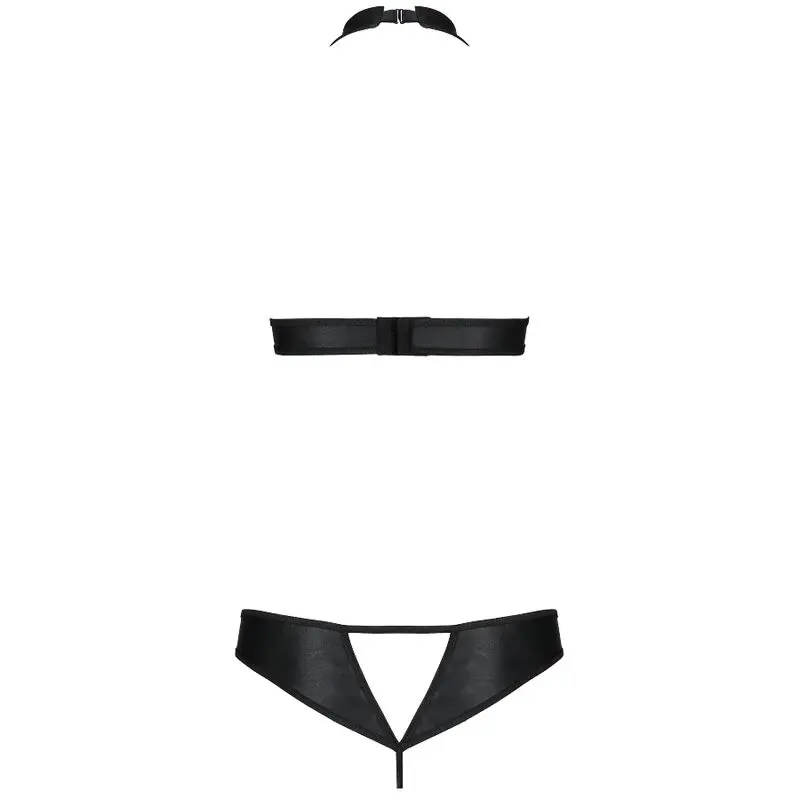 Malwia es un conjunto formado por un top de cuero sujeta al cuello con aros decorativo y cordones, que enfatiza y realza el busto y el tanga con un encantador recorte. Las juntas decorativas en forma de círculos, dan un encanto peculiar.