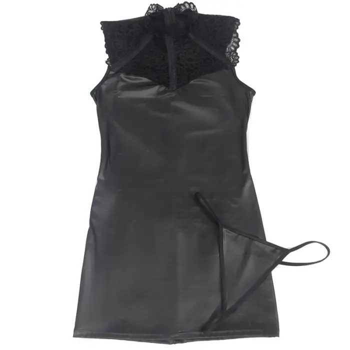 - Diseño Sofisticado: Este vestido de lencería combina el encaje negro con detalles de cuero, creando un contraste visualmente impactante que emana sensualidad y sofisticación.