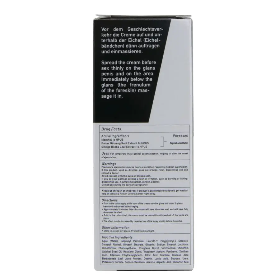 Su composición contiene ginkgo biloba, reconocido por sus propiedades para mejorar la circulación y fortalecer el rendimiento, lo que contribuye a un mayor control y resistencia. Al aplicar la crema antes del acto, podrá beneficiarse de sus efectos de larga duración, permitiéndole no solo extender la intimidad, sino también recuperar la confianza y el dominio total de sus sensaciones.