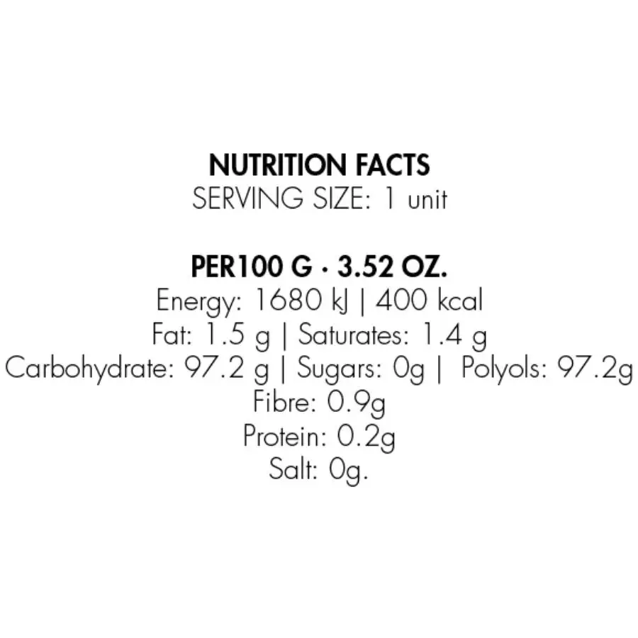 Ingredientes: Sweeteners (Sorbitol – E420, Xylitol – E967, Sucralose – E955), anticaking agent (Magnesium stearate – E470b), aromas (Menthol crystal,Peppermint flavor,Cooling agent)